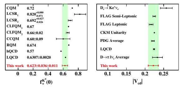 图 4:(a)测定的形状因子零点值与多种理论计算结果的比较图. (b) 测定的CKM矩阵元|Vcd| 与理论文献的对比图。