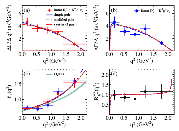 图 2:半轻衰变 (a) Ds+→K0e+νe 和 (b) Ds+→K0μ+νμ分宽度的联合拟合结果。(c) 数据中测量的 Ds+→K0 衰变的形状因子随q2的运动学依赖。(d) 不同q2区间内测量的Rμ/e(q2) 值。
